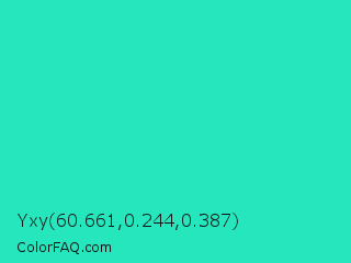 Yxy 60.661,0.244,0.387 Color is a normal cyan color and the nearest color is Turquoise PWG #30d5c8. Hex code #25e6bd and RGB value is rgb(37,230,189). In RGB color space, this color is composed of 15% red, 90% green, 74% blue, In CMYK color space, this color is composed of 84% cyan, 0% magenta, 18% yellow , 10% black , In HSL color space, this color has a hue angle of 167° , 79% saturation and 52% lightness.