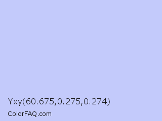 Yxy 60.675,0.275,0.274 Color is a very light blue color and the nearest color is Periwinkle #ccccff. Hex code #c3cafb and RGB value is rgb(195,202,251). In RGB color space, this color is composed of 76% red, 79% green, 98% blue, In CMYK color space, this color is composed of 22% cyan, 20% magenta, 0% yellow , 2% black , In HSL color space, this color has a hue angle of 233° , 88% saturation and 87% lightness.