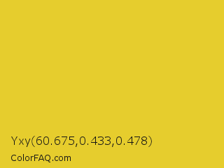 Yxy 60.675,0.433,0.478 Color is a normal yellow color and the nearest color is Golden Dream #f0d52d. Hex code #e6cd2d and RGB value is rgb(230,205,45). In RGB color space, this color is composed of 90% red, 80% green, 18% blue, In CMYK color space, this color is composed of 0% cyan, 11% magenta, 80% yellow , 10% black , In HSL color space, this color has a hue angle of 52° , 79% saturation and 54% lightness.
