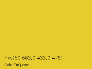 Yxy 60.683,0.433,0.478 Color is a normal yellow color and the nearest color is Golden Dream #f0d52d. Hex code #e6cd2d and RGB value is rgb(230,205,45). In RGB color space, this color is composed of 90% red, 80% green, 18% blue, In CMYK color space, this color is composed of 0% cyan, 11% magenta, 80% yellow , 10% black , In HSL color space, this color has a hue angle of 52° , 79% saturation and 54% lightness.