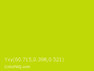 Yxy 60.715,0.398,0.521 Color is a normal yellow color and the nearest color is Fuego #bede0d. Hex code #bfd906 and RGB value is rgb(191,217,6). In RGB color space, this color is composed of 75% red, 85% green, 2% blue, In CMYK color space, this color is composed of 12% cyan, 0% magenta, 97% yellow , 15% black , In HSL color space, this color has a hue angle of 67° , 95% saturation and 44% lightness.