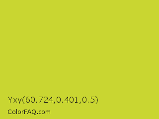Yxy 60.724,0.401,0.5 Color is a normal yellow color and the nearest color is Pear #d1e231. Hex code #c9d631 and RGB value is rgb(201,214,49). In RGB color space, this color is composed of 79% red, 84% green, 19% blue, In CMYK color space, this color is composed of 6% cyan, 0% magenta, 77% yellow , 16% black , In HSL color space, this color has a hue angle of 65° , 67% saturation and 52% lightness.