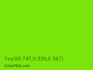 Yxy 60.747,0.339,0.567 Color is a normal green color and the nearest color is Alien Armpit #84de02. Hex code #7ae609 and RGB value is rgb(122,230,9). In RGB color space, this color is composed of 48% red, 90% green, 4% blue, In CMYK color space, this color is composed of 47% cyan, 0% magenta, 96% yellow , 10% black , In HSL color space, this color has a hue angle of 89° , 92% saturation and 47% lightness.