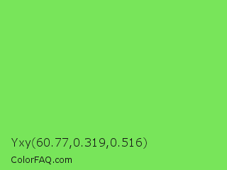 Yxy 60.77,0.319,0.516 Color is a light green color and the nearest color is Pastel Green #77dd77. Hex code #78e55a and RGB value is rgb(120,229,90). In RGB color space, this color is composed of 47% red, 90% green, 35% blue, In CMYK color space, this color is composed of 48% cyan, 0% magenta, 61% yellow , 10% black , In HSL color space, this color has a hue angle of 107° , 73% saturation and 63% lightness.