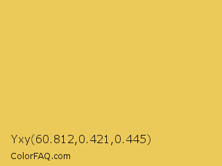 Yxy 60.812,0.421,0.445 Color is a light yellow color and the nearest color is Cream Can #f5c85c. Hex code #ecca5a and RGB value is rgb(236,202,90). In RGB color space, this color is composed of 93% red, 79% green, 35% blue, In CMYK color space, this color is composed of 0% cyan, 14% magenta, 62% yellow , 7% black , In HSL color space, this color has a hue angle of 46° , 79% saturation and 64% lightness.
