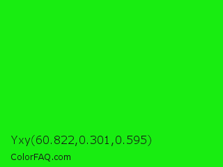 Yxy 60.822,0.301,0.595 Color is a normal green color and the nearest color is Green #00ff00. Hex code #18ed11 and RGB value is rgb(24,237,17). In RGB color space, this color is composed of 9% red, 93% green, 7% blue, In CMYK color space, this color is composed of 90% cyan, 0% magenta, 93% yellow , 7% black , In HSL color space, this color has a hue angle of 118° , 87% saturation and 50% lightness.