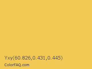 Yxy 60.826,0.431,0.445 Color is a light orange color and the nearest color is Cream Can #f5c85c. Hex code #f2c854 and RGB value is rgb(242,200,84). In RGB color space, this color is composed of 95% red, 78% green, 33% blue, In CMYK color space, this color is composed of 0% cyan, 17% magenta, 65% yellow , 5% black , In HSL color space, this color has a hue angle of 44° , 86% saturation and 64% lightness.