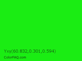 Yxy 60.832,0.301,0.594 Color is a normal green color and the nearest color is Neon Green #39ff14. Hex code #1aed13 and RGB value is rgb(26,237,19). In RGB color space, this color is composed of 10% red, 93% green, 7% blue, In CMYK color space, this color is composed of 89% cyan, 0% magenta, 92% yellow , 7% black , In HSL color space, this color has a hue angle of 118° , 86% saturation and 50% lightness.