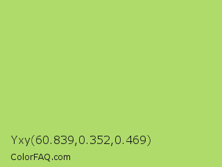 Yxy 60.839,0.352,0.469 Color is a light green color and the nearest color is Inchworm #b2ec5d. Hex code #afdb6b and RGB value is rgb(175,219,107). In RGB color space, this color is composed of 69% red, 86% green, 42% blue, In CMYK color space, this color is composed of 20% cyan, 0% magenta, 51% yellow , 14% black , In HSL color space, this color has a hue angle of 84° , 61% saturation and 64% lightness.