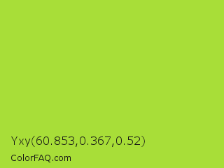 Yxy 60.853,0.367,0.52 Color is a normal green color and the nearest color is Conifer #acdd4d. Hex code #a8de38 and RGB value is rgb(168,222,56). In RGB color space, this color is composed of 66% red, 87% green, 22% blue, In CMYK color space, this color is composed of 24% cyan, 0% magenta, 75% yellow , 13% black , In HSL color space, this color has a hue angle of 80° , 72% saturation and 55% lightness.