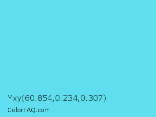 Yxy 60.854,0.234,0.307 Color is a light cyan color and the nearest color is Turquoise Blue #6cdae7. Hex code #5fdeef and RGB value is rgb(95,222,239). In RGB color space, this color is composed of 37% red, 87% green, 94% blue, In CMYK color space, this color is composed of 60% cyan, 7% magenta, 0% yellow , 6% black , In HSL color space, this color has a hue angle of 187° , 82% saturation and 65% lightness.