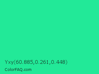 Yxy 60.885,0.261,0.448 Color is a normal green color and the nearest color is Shamrock #33cc99. Hex code #22e998 and RGB value is rgb(34,233,152). In RGB color space, this color is composed of 13% red, 91% green, 60% blue, In CMYK color space, this color is composed of 85% cyan, 0% magenta, 35% yellow , 9% black , In HSL color space, this color has a hue angle of 156° , 82% saturation and 52% lightness.