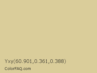 Yxy 60.901,0.361,0.388 Color is a light yellow color and the nearest color is Winter Hazel #d5d195. Hex code #dacd9a and RGB value is rgb(218,205,154). In RGB color space, this color is composed of 85% red, 80% green, 60% blue, In CMYK color space, this color is composed of 0% cyan, 6% magenta, 29% yellow , 15% black , In HSL color space, this color has a hue angle of 48° , 46% saturation and 73% lightness.