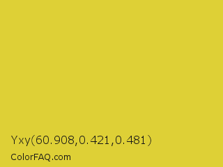 Yxy 60.908,0.421,0.481 Color is a normal yellow color and the nearest color is Sandstorm #ecd540. Hex code #ded036 and RGB value is rgb(222,208,54). In RGB color space, this color is composed of 87% red, 82% green, 21% blue, In CMYK color space, this color is composed of 0% cyan, 6% magenta, 76% yellow , 13% black , In HSL color space, this color has a hue angle of 55° , 72% saturation and 54% lightness.