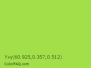 Yxy 60.925,0.357,0.512 Color is a normal green color and the nearest color is Conifer #acdd4d. Hex code #a2df48 and RGB value is rgb(162,223,72). In RGB color space, this color is composed of 64% red, 87% green, 28% blue, In CMYK color space, this color is composed of 27% cyan, 0% magenta, 68% yellow , 13% black , In HSL color space, this color has a hue angle of 84° , 70% saturation and 58% lightness.