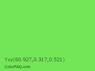 Yxy 60.927,0.317,0.521 Color is a light green color and the nearest color is Screamin Green #66ff66. Hex code #73e658 and RGB value is rgb(115,230,88). In RGB color space, this color is composed of 45% red, 90% green, 35% blue, In CMYK color space, this color is composed of 50% cyan, 0% magenta, 62% yellow , 10% black , In HSL color space, this color has a hue angle of 109° , 74% saturation and 62% lightness.