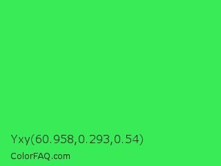 Yxy 60.958,0.293,0.54 Color is a normal green color and the nearest color is UFO Green #3cd070. Hex code #39eb56 and RGB value is rgb(57,235,86). In RGB color space, this color is composed of 22% red, 92% green, 34% blue, In CMYK color space, this color is composed of 76% cyan, 0% magenta, 63% yellow , 8% black , In HSL color space, this color has a hue angle of 130° , 82% saturation and 57% lightness.