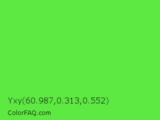 Yxy 60.987,0.313,0.552 Color is a normal green color and the nearest color is Screamin Green #66ff66. Hex code #5de941 and RGB value is rgb(93,233,65). In RGB color space, this color is composed of 36% red, 91% green, 25% blue, In CMYK color space, this color is composed of 60% cyan, 0% magenta, 72% yellow , 9% black , In HSL color space, this color has a hue angle of 110° , 79% saturation and 58% lightness.