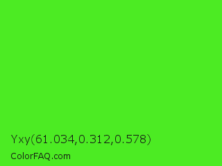 Yxy 61.034,0.312,0.578 Color is a normal green color and the nearest color is Neon Green #39ff14. Hex code #4ceb23 and RGB value is rgb(76,235,35). In RGB color space, this color is composed of 30% red, 92% green, 14% blue, In CMYK color space, this color is composed of 68% cyan, 0% magenta, 85% yellow , 8% black , In HSL color space, this color has a hue angle of 108° , 83% saturation and 53% lightness.