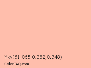 Yxy 61.065,0.382,0.348 Color is a very light red color and the nearest color is Melon Crayola #febaad. Hex code #ffbeac and RGB value is rgb(255,190,172). In RGB color space, this color is composed of 100% red, 75% green, 67% blue, In CMYK color space, this color is composed of 0% cyan, 25% magenta, 33% yellow , 0% black , In HSL color space, this color has a hue angle of 13° , 100% saturation and 84% lightness.