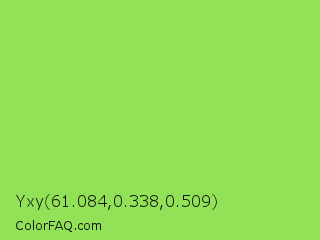 Yxy 61.084,0.338,0.509 Color is a light green color and the nearest color is Kiwi #8ee53f. Hex code #91e256 and RGB value is rgb(145,226,86). In RGB color space, this color is composed of 57% red, 89% green, 34% blue, In CMYK color space, this color is composed of 36% cyan, 0% magenta, 62% yellow , 11% black , In HSL color space, this color has a hue angle of 95° , 71% saturation and 61% lightness.