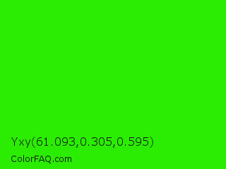 Yxy 61.093,0.305,0.595 Color is a normal green color and the nearest color is Harlequin #3fff00. Hex code #2bed04 and RGB value is rgb(43,237,4). In RGB color space, this color is composed of 17% red, 93% green, 2% blue, In CMYK color space, this color is composed of 82% cyan, 0% magenta, 98% yellow , 7% black , In HSL color space, this color has a hue angle of 110° , 97% saturation and 47% lightness.