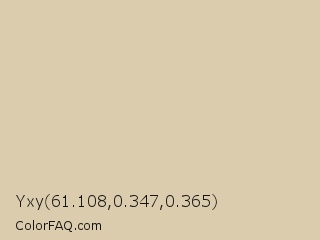 Yxy 61.108,0.347,0.365 Color is a light orange color and the nearest color is Akaroa #d4c4a8. Hex code #daccad and RGB value is rgb(218,204,173). In RGB color space, this color is composed of 85% red, 80% green, 68% blue, In CMYK color space, this color is composed of 0% cyan, 6% magenta, 21% yellow , 15% black , In HSL color space, this color has a hue angle of 41° , 38% saturation and 77% lightness.