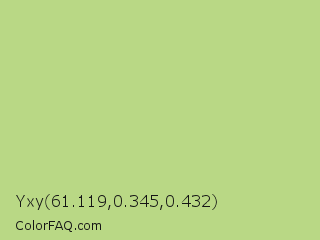 Yxy 61.119,0.345,0.432 Color is a light green color and the nearest color is Medium Spring Bud #c9dc87. Hex code #b9d885 and RGB value is rgb(185,216,133). In RGB color space, this color is composed of 73% red, 85% green, 52% blue, In CMYK color space, this color is composed of 14% cyan, 0% magenta, 38% yellow , 15% black , In HSL color space, this color has a hue angle of 82° , 52% saturation and 68% lightness.