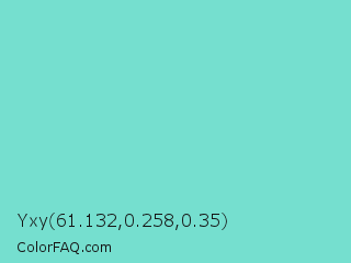 Yxy 61.132,0.258,0.35 Color is a light cyan color and the nearest color is Bermuda #7dd8c6. Hex code #75dfcf and RGB value is rgb(117,223,207). In RGB color space, this color is composed of 46% red, 87% green, 81% blue, In CMYK color space, this color is composed of 48% cyan, 0% magenta, 7% yellow , 13% black , In HSL color space, this color has a hue angle of 171° , 62% saturation and 67% lightness.