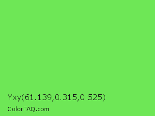 Yxy 61.139,0.315,0.525 Color is a light green color and the nearest color is Screamin Green #66ff66. Hex code #6ee756 and RGB value is rgb(110,231,86). In RGB color space, this color is composed of 43% red, 91% green, 34% blue, In CMYK color space, this color is composed of 52% cyan, 0% magenta, 63% yellow , 9% black , In HSL color space, this color has a hue angle of 110° , 75% saturation and 62% lightness.