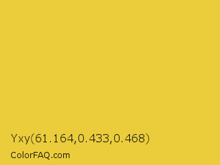 Yxy 61.164,0.433,0.468 Color is a normal yellow color and the nearest color is Sandstorm #ecd540. Hex code #ebcc3b and RGB value is rgb(235,204,59). In RGB color space, this color is composed of 92% red, 80% green, 23% blue, In CMYK color space, this color is composed of 0% cyan, 13% magenta, 75% yellow , 8% black , In HSL color space, this color has a hue angle of 49° , 81% saturation and 58% lightness.