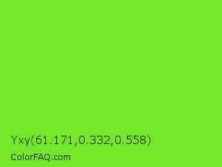 Yxy 61.171,0.332,0.558 Color is a normal green color and the nearest color is Spring Frost #87ff2a. Hex code #75e72a and RGB value is rgb(117,231,42). In RGB color space, this color is composed of 46% red, 91% green, 16% blue, In CMYK color space, this color is composed of 49% cyan, 0% magenta, 82% yellow , 9% black , In HSL color space, this color has a hue angle of 96° , 80% saturation and 54% lightness.
