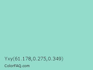 Yxy 61.178,0.275,0.349 Color is a light cyan color and the nearest color is Middle Blue Green #8dd9cc. Hex code #93dbcb and RGB value is rgb(147,219,203). In RGB color space, this color is composed of 58% red, 86% green, 80% blue, In CMYK color space, this color is composed of 33% cyan, 0% magenta, 7% yellow , 14% black , In HSL color space, this color has a hue angle of 167° , 50% saturation and 72% lightness.