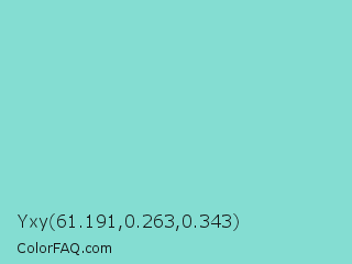 Yxy 61.191,0.263,0.343 Color is a light cyan color and the nearest color is Middle Blue Green #8dd9cc. Hex code #84ddd2 and RGB value is rgb(132,221,210). In RGB color space, this color is composed of 52% red, 87% green, 82% blue, In CMYK color space, this color is composed of 40% cyan, 0% magenta, 5% yellow , 13% black , In HSL color space, this color has a hue angle of 173° , 57% saturation and 69% lightness.