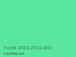 Yxy 61.202,0.273,0.433 Color is a light green color and the nearest color is Medium Aquamarine #66ddaa. Hex code #5ae69d and RGB value is rgb(90,230,157). In RGB color space, this color is composed of 35% red, 90% green, 62% blue, In CMYK color space, this color is composed of 61% cyan, 0% magenta, 32% yellow , 10% black , In HSL color space, this color has a hue angle of 149° , 74% saturation and 63% lightness.