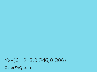 Yxy 61.213,0.246,0.306 Color is a light cyan color and the nearest color is Medium Sky Blue #80daeb. Hex code #7edbed and RGB value is rgb(126,219,237). In RGB color space, this color is composed of 49% red, 86% green, 93% blue, In CMYK color space, this color is composed of 47% cyan, 8% magenta, 0% yellow , 7% black , In HSL color space, this color has a hue angle of 190° , 76% saturation and 71% lightness.