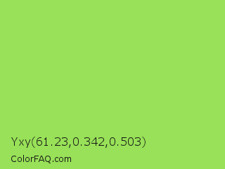 Yxy 61.23,0.342,0.503 Color is a light green color and the nearest color is Conifer #acdd4d. Hex code #98e158 and RGB value is rgb(152,225,88). In RGB color space, this color is composed of 60% red, 88% green, 35% blue, In CMYK color space, this color is composed of 32% cyan, 0% magenta, 61% yellow , 12% black , In HSL color space, this color has a hue angle of 92° , 70% saturation and 61% lightness.