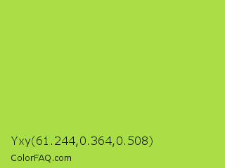 Yxy 61.244,0.364,0.508 Color is a normal green color and the nearest color is Conifer #acdd4d. Hex code #aade47 and RGB value is rgb(170,222,71). In RGB color space, this color is composed of 67% red, 87% green, 28% blue, In CMYK color space, this color is composed of 23% cyan, 0% magenta, 68% yellow , 13% black , In HSL color space, this color has a hue angle of 81° , 70% saturation and 57% lightness.