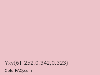Yxy 61.252,0.342,0.323 Color is a very light red color and the nearest color is Orchid Pink #f2bdcd. Hex code #edc3c9 and RGB value is rgb(237,195,201). In RGB color space, this color is composed of 93% red, 76% green, 79% blue, In CMYK color space, this color is composed of 0% cyan, 18% magenta, 15% yellow , 7% black , In HSL color space, this color has a hue angle of 351° , 54% saturation and 85% lightness.
