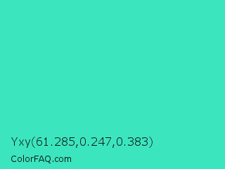 Yxy 61.285,0.247,0.383 Color is a normal cyan color and the nearest color is Turquoise #40e0d0. Hex code #3be6bf and RGB value is rgb(59,230,191). In RGB color space, this color is composed of 23% red, 90% green, 75% blue, In CMYK color space, this color is composed of 74% cyan, 0% magenta, 17% yellow , 10% black , In HSL color space, this color has a hue angle of 166° , 77% saturation and 57% lightness.