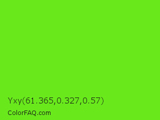 Yxy 61.365,0.327,0.57 Color is a normal green color and the nearest color is Bright Green #66ff00. Hex code #69e91c and RGB value is rgb(105,233,28). In RGB color space, this color is composed of 41% red, 91% green, 11% blue, In CMYK color space, this color is composed of 55% cyan, 0% magenta, 88% yellow , 9% black , In HSL color space, this color has a hue angle of 97° , 82% saturation and 51% lightness.