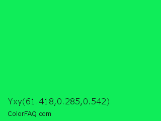 Yxy 61.418,0.285,0.542 Color is a normal green color and the nearest color is Malachite #0bda51. Hex code #0fed59 and RGB value is rgb(15,237,89). In RGB color space, this color is composed of 6% red, 93% green, 35% blue, In CMYK color space, this color is composed of 94% cyan, 0% magenta, 62% yellow , 7% black , In HSL color space, this color has a hue angle of 140° , 88% saturation and 49% lightness.