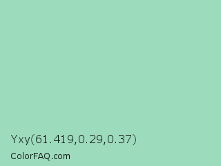 Yxy 61.419,0.29,0.37 Color is a light green color and the nearest color is Sea Foam Green #9fe2bf. Hex code #9cdbbb and RGB value is rgb(156,219,187). In RGB color space, this color is composed of 61% red, 86% green, 73% blue, In CMYK color space, this color is composed of 29% cyan, 0% magenta, 15% yellow , 14% black , In HSL color space, this color has a hue angle of 150° , 47% saturation and 74% lightness.