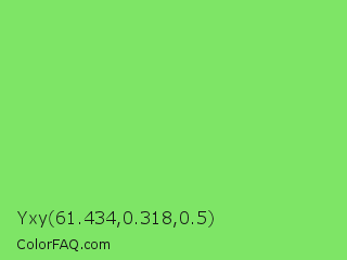 Yxy 61.434,0.318,0.5 Color is a light green color and the nearest color is Pastel Green #77dd77. Hex code #7ee566 and RGB value is rgb(126,229,102). In RGB color space, this color is composed of 49% red, 90% green, 40% blue, In CMYK color space, this color is composed of 45% cyan, 0% magenta, 55% yellow , 10% black , In HSL color space, this color has a hue angle of 109° , 71% saturation and 65% lightness.