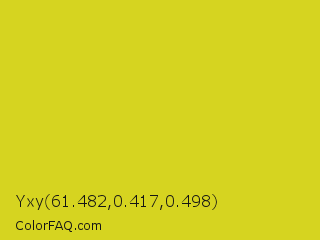 Yxy 61.482,0.417,0.498 Color is a normal yellow color and the nearest color is Bird Flower #d4cd16. Hex code #d6d420 and RGB value is rgb(214,212,32). In RGB color space, this color is composed of 84% red, 83% green, 13% blue, In CMYK color space, this color is composed of 0% cyan, 1% magenta, 85% yellow , 16% black , In HSL color space, this color has a hue angle of 59° , 74% saturation and 48% lightness.