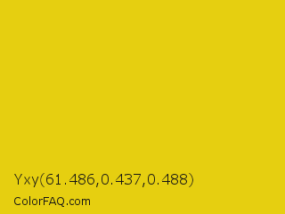 Yxy 61.486,0.437,0.488 Color is a normal yellow color and the nearest color is Citrine #e4d00a. Hex code #e6cf10 and RGB value is rgb(230,207,16). In RGB color space, this color is composed of 90% red, 81% green, 6% blue, In CMYK color space, this color is composed of 0% cyan, 10% magenta, 93% yellow , 10% black , In HSL color space, this color has a hue angle of 54° , 87% saturation and 48% lightness.