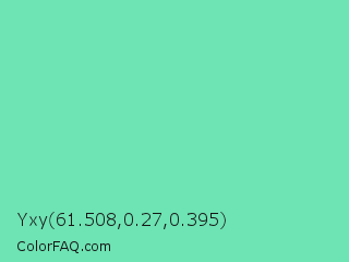 Yxy 61.508,0.27,0.395 Color is a light green color and the nearest color is Medium Aquamarine #66ddaa. Hex code #6ee3b3 and RGB value is rgb(110,227,179). In RGB color space, this color is composed of 43% red, 89% green, 70% blue, In CMYK color space, this color is composed of 52% cyan, 0% magenta, 21% yellow , 11% black , In HSL color space, this color has a hue angle of 155° , 68% saturation and 66% lightness.