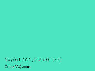 Yxy 61.511,0.25,0.377 Color is a normal cyan color and the nearest color is Turquoise #40e0d0. Hex code #4ce5c2 and RGB value is rgb(76,229,194). In RGB color space, this color is composed of 30% red, 90% green, 76% blue, In CMYK color space, this color is composed of 67% cyan, 0% magenta, 15% yellow , 10% black , In HSL color space, this color has a hue angle of 166° , 75% saturation and 60% lightness.