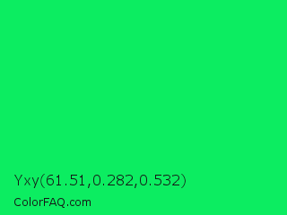 Yxy 61.51,0.282,0.532 Color is a normal green color and the nearest color is Malachite #0bda51. Hex code #0ced61 and RGB value is rgb(12,237,97). In RGB color space, this color is composed of 5% red, 93% green, 38% blue, In CMYK color space, this color is composed of 95% cyan, 0% magenta, 59% yellow , 7% black , In HSL color space, this color has a hue angle of 143° , 90% saturation and 49% lightness.