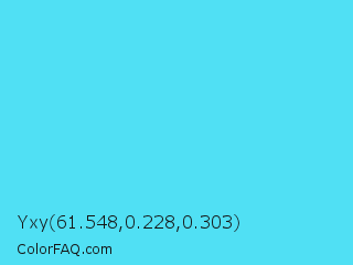 Yxy 61.548,0.228,0.303 Color is a light cyan color and the nearest color is Turquoise Blue #6cdae7. Hex code #50e0f4 and RGB value is rgb(80,224,244). In RGB color space, this color is composed of 31% red, 88% green, 96% blue, In CMYK color space, this color is composed of 67% cyan, 8% magenta, 0% yellow , 4% black , In HSL color space, this color has a hue angle of 187° , 88% saturation and 64% lightness.